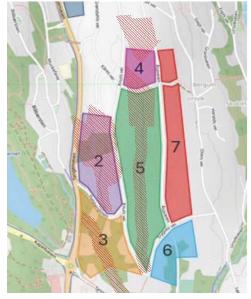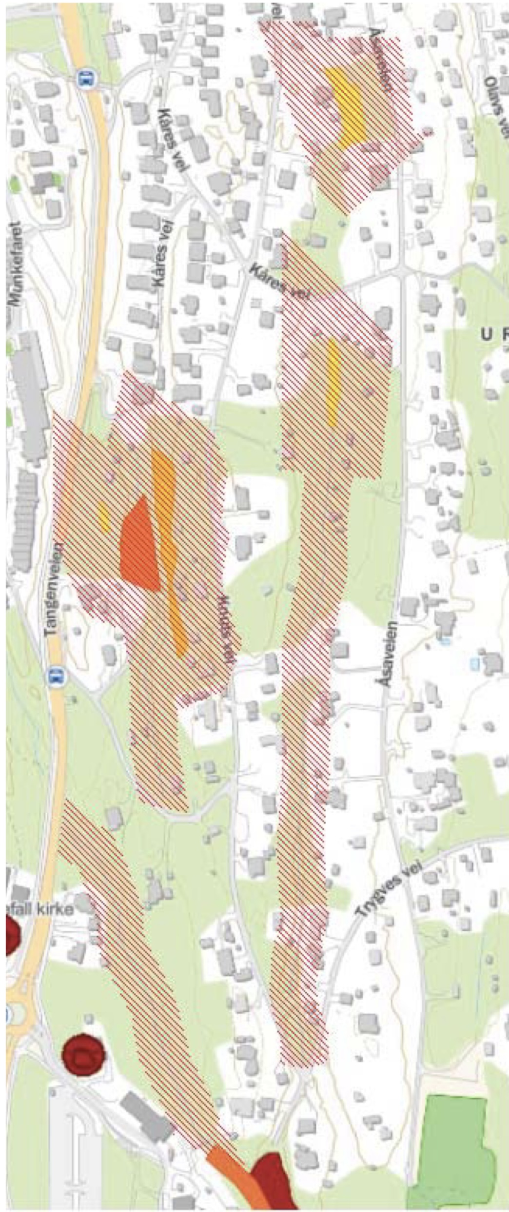 På vedlagte kart er hensynssonene lagt inn, noe som tydelig viser hvor lite egnet området er for